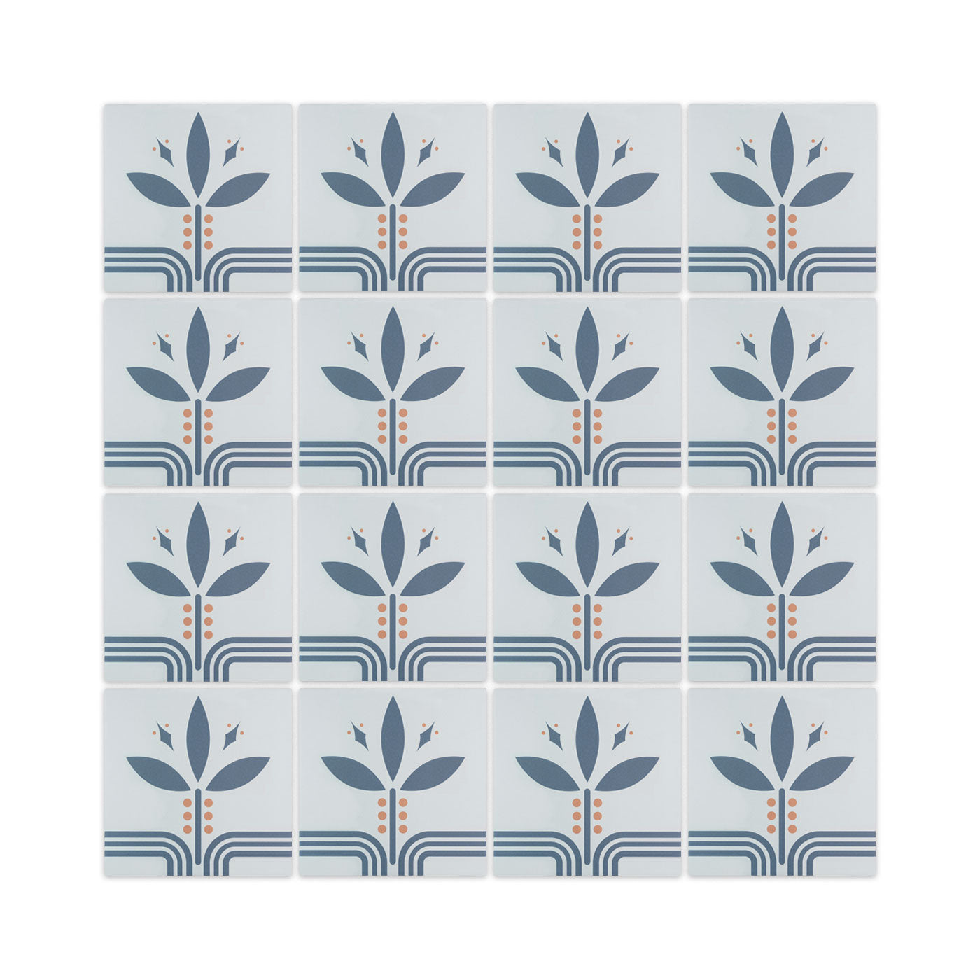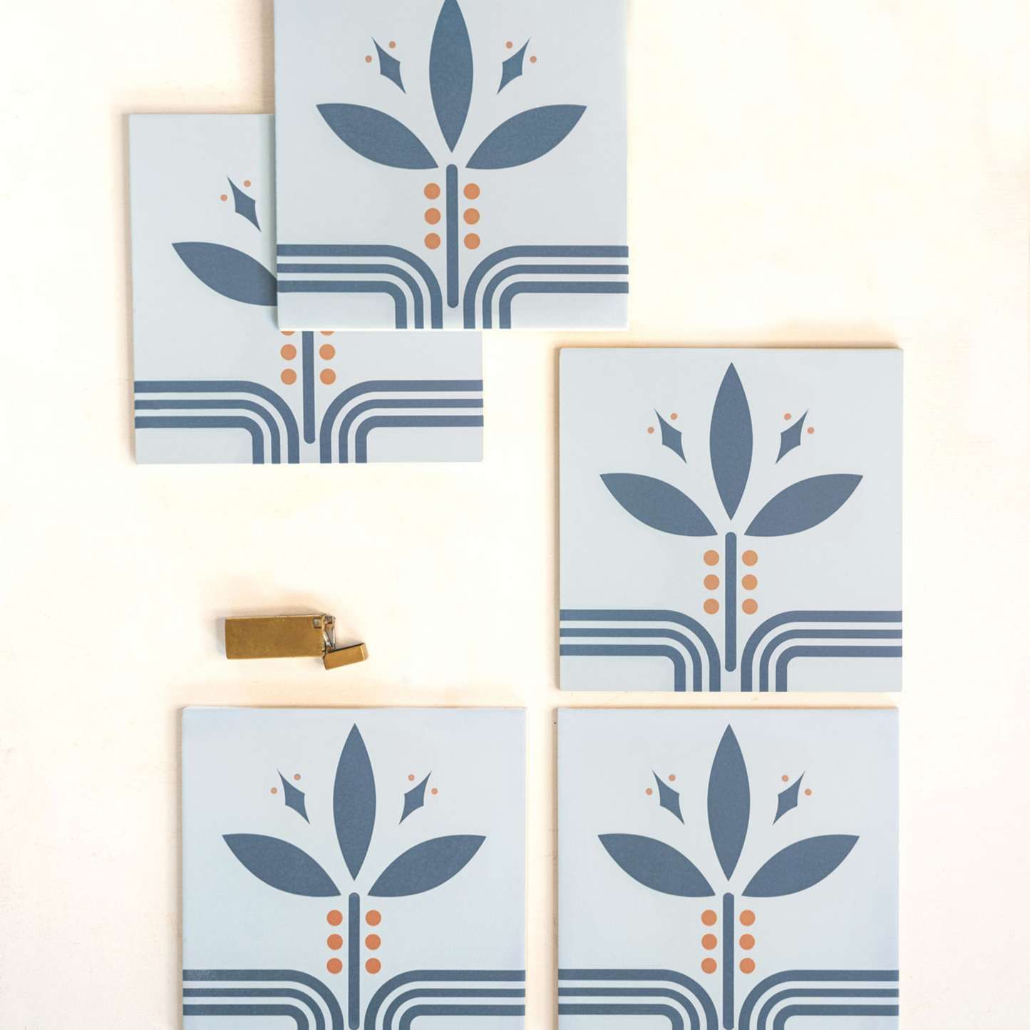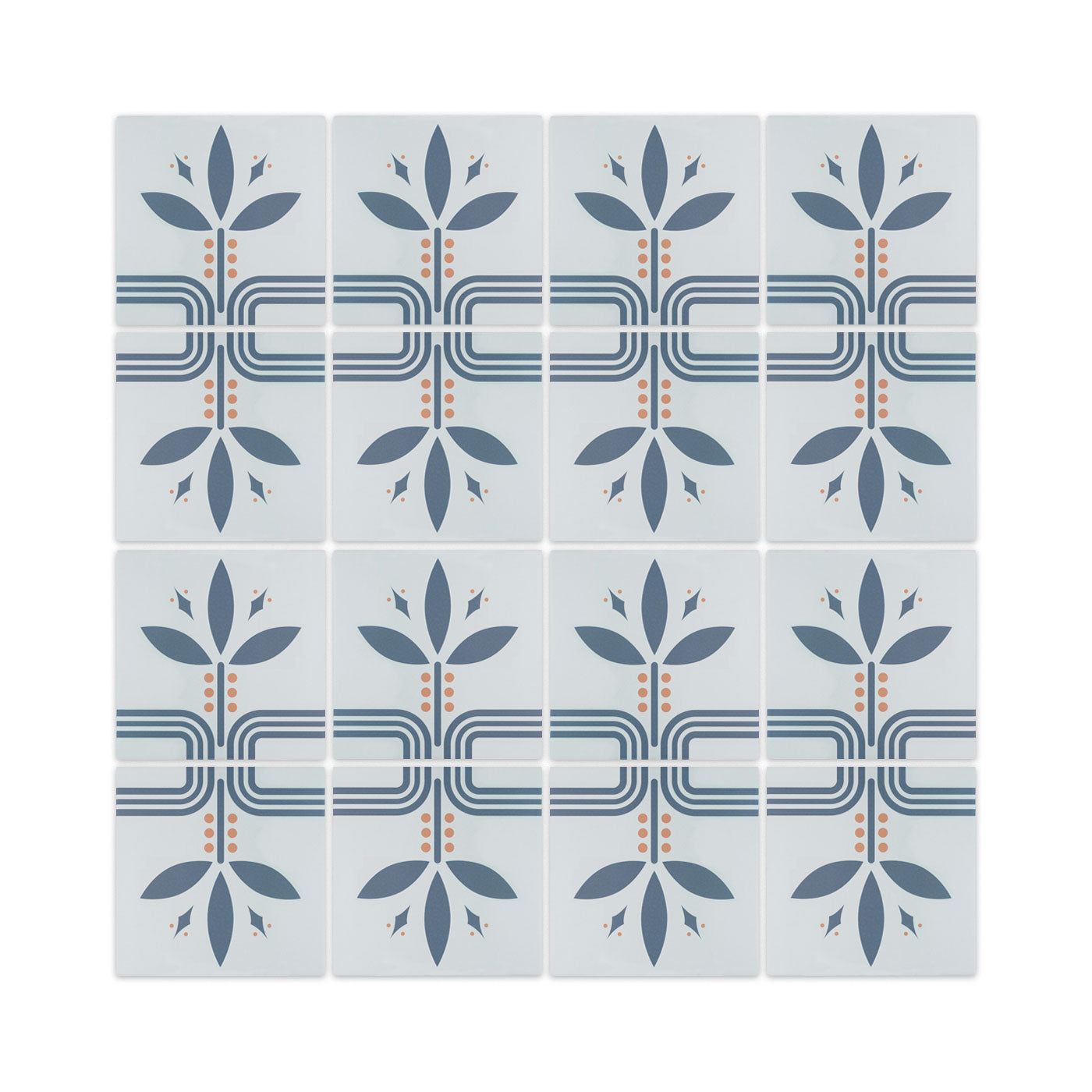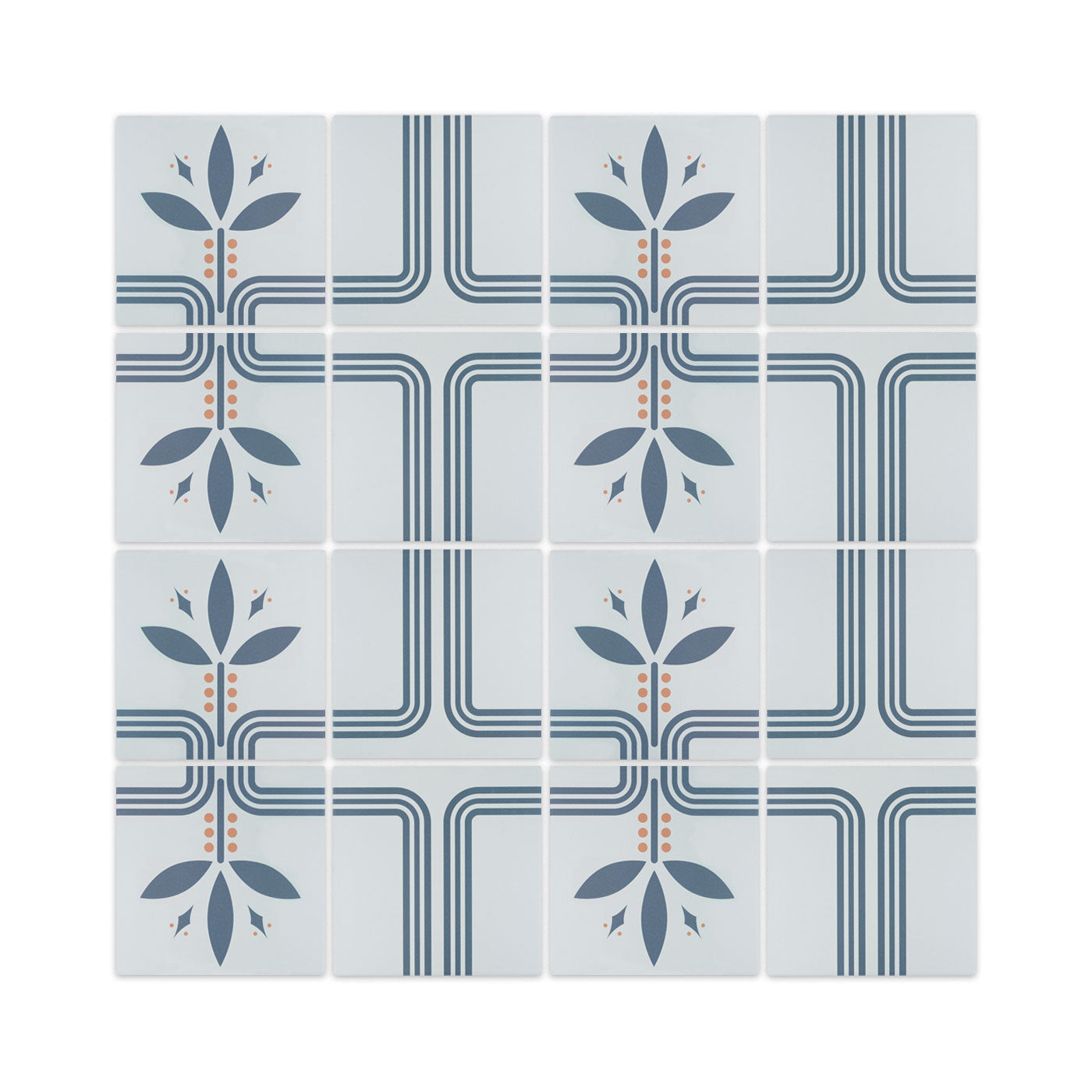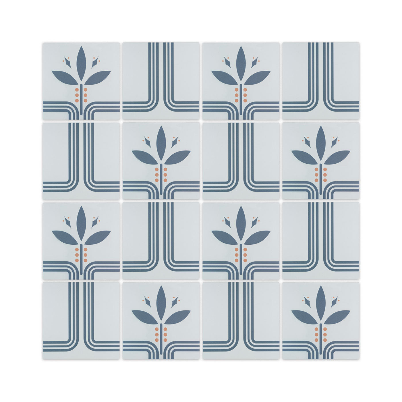 Spanish for "berries", this design balances a vintage cowboy boot-inspired motif with retro geometric design elements. Its versatile design can ride solo or pair up with Conectada Day Trip for a larger scale pattern. Vibrant matte glazes and durable surface allow for a wide variety of applications including walls, floors and wet areas.