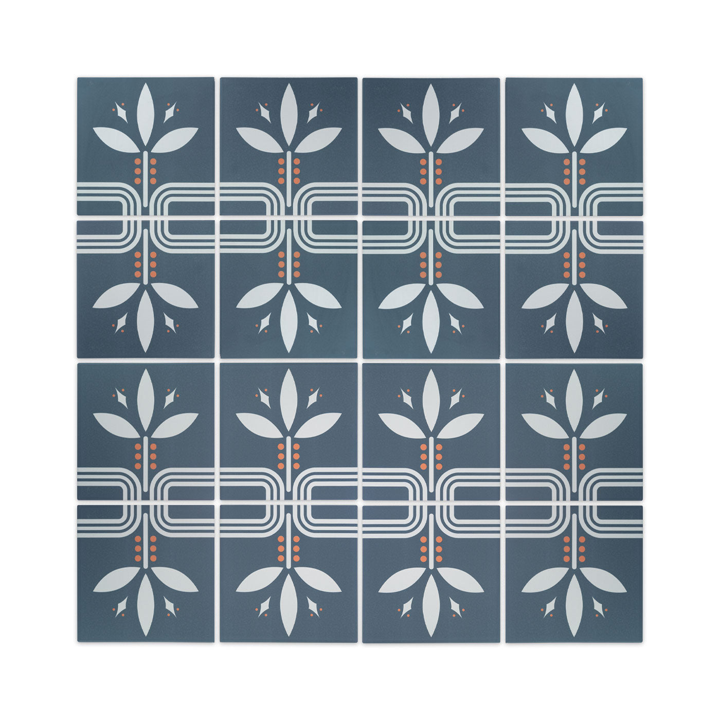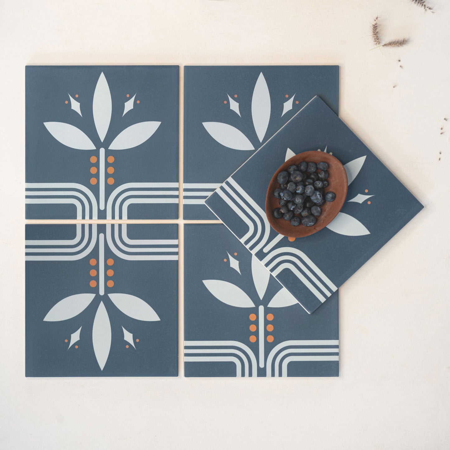 Spanish for "berries", this design balances a vintage cowboy boot-inspired motif with retro geometric design elements. Its versatile design can ride solo or pair up with Conectada Midnight for a larger scale pattern. Vibrant matte glazes and durable surface allow for a wide variety of applications including walls, floors and wet areas.
