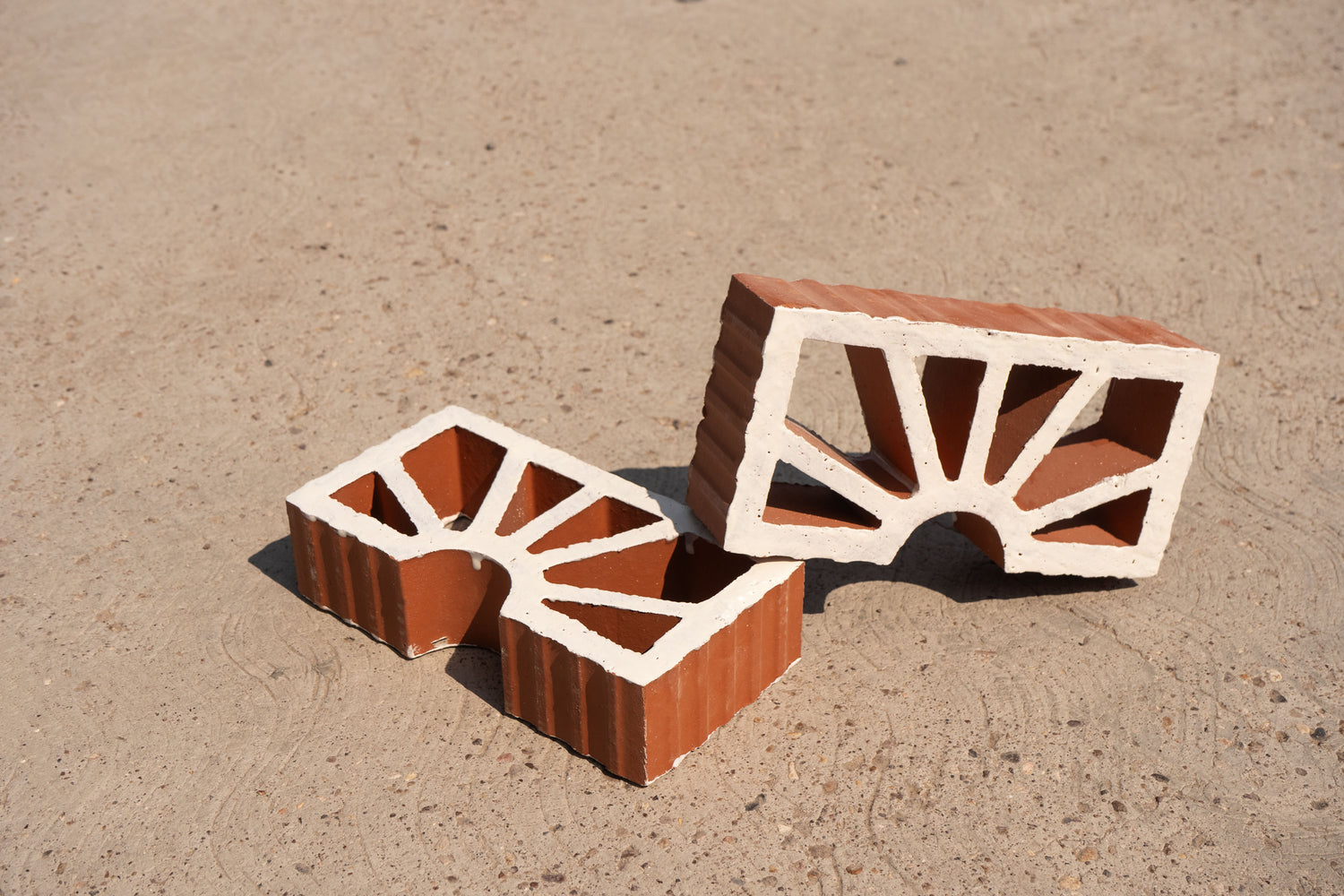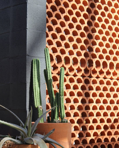 Mexico, of course! We produce our Clay Imports breeze blocks using 100% natural clay native to Central Mexico. Each piece is produced by extracting dense red clay through a patterned dye (think Play-Doh). Then, the block is fired. Voilà, a decorative breeze block for any project.