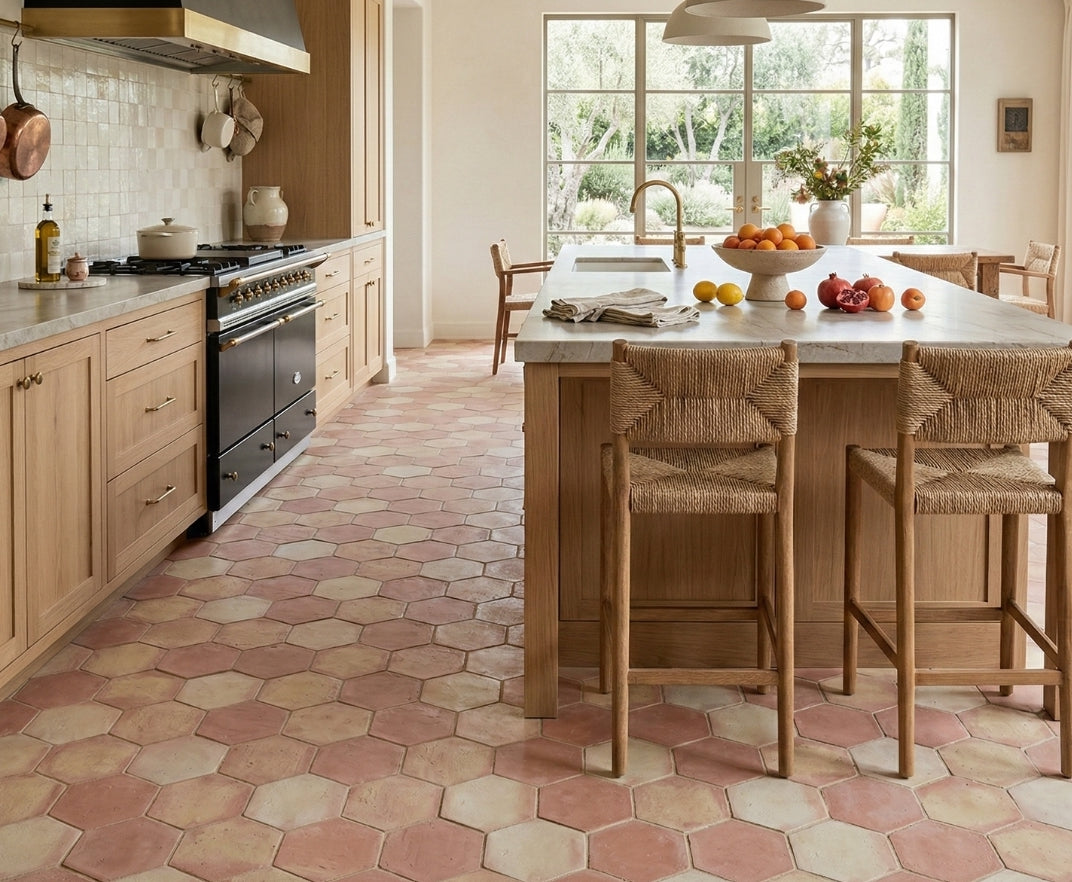 The tiles are sun dried and wood fired in artisanal kilns, a process that enhances their natural tonal movement and creates the distinctive patterns and variation Saltillo is known for.
