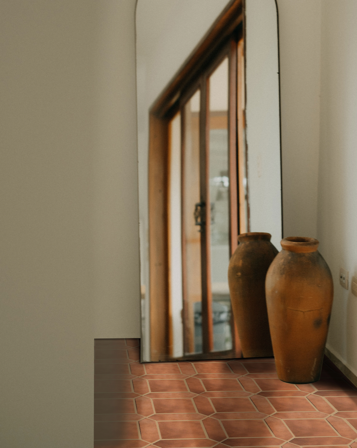 Wood Transition: You can use a matching wood door transition piece for a seamless shift from terracotta to wood flooring, creating a connection. It may have a slight elevation depending on the installation surface heights.