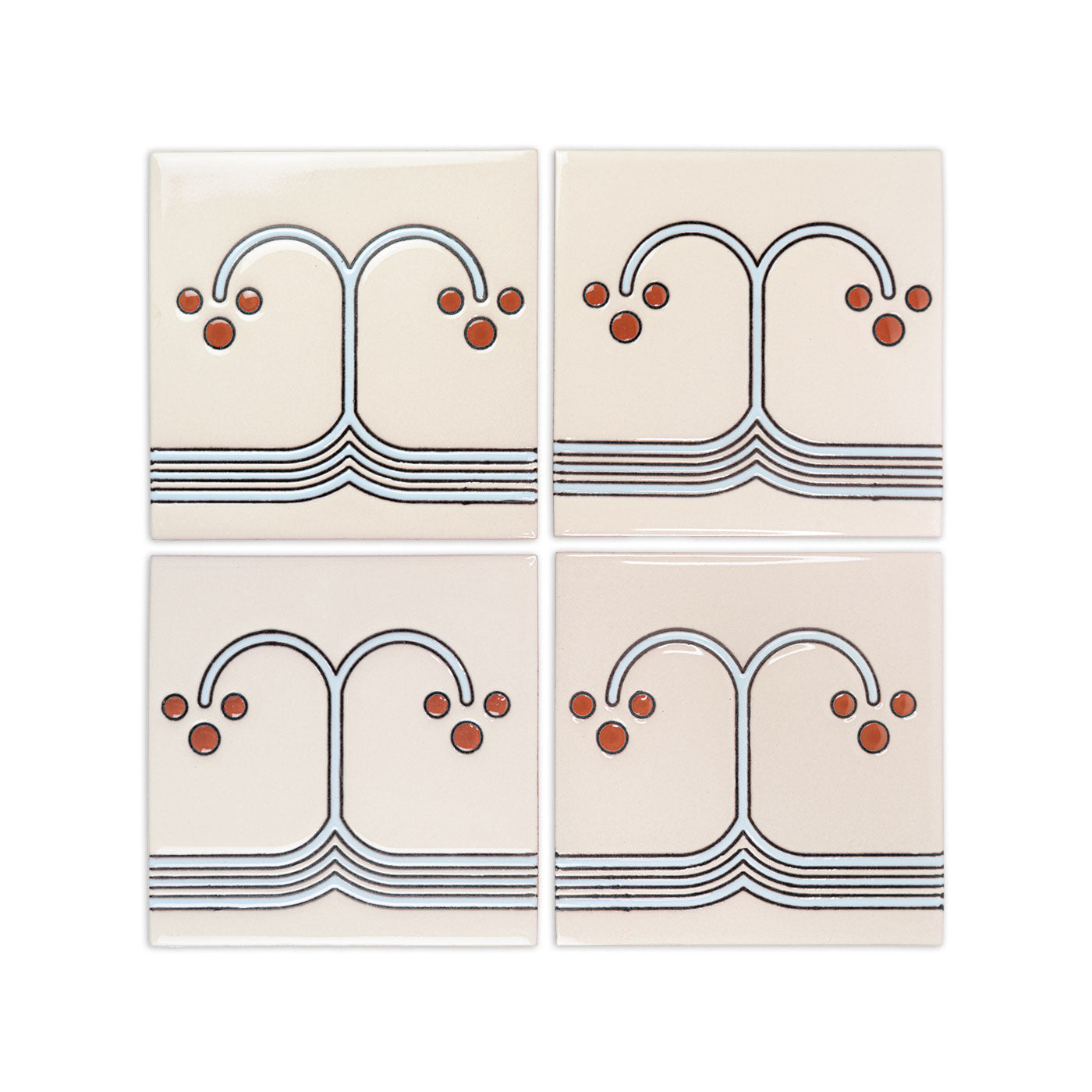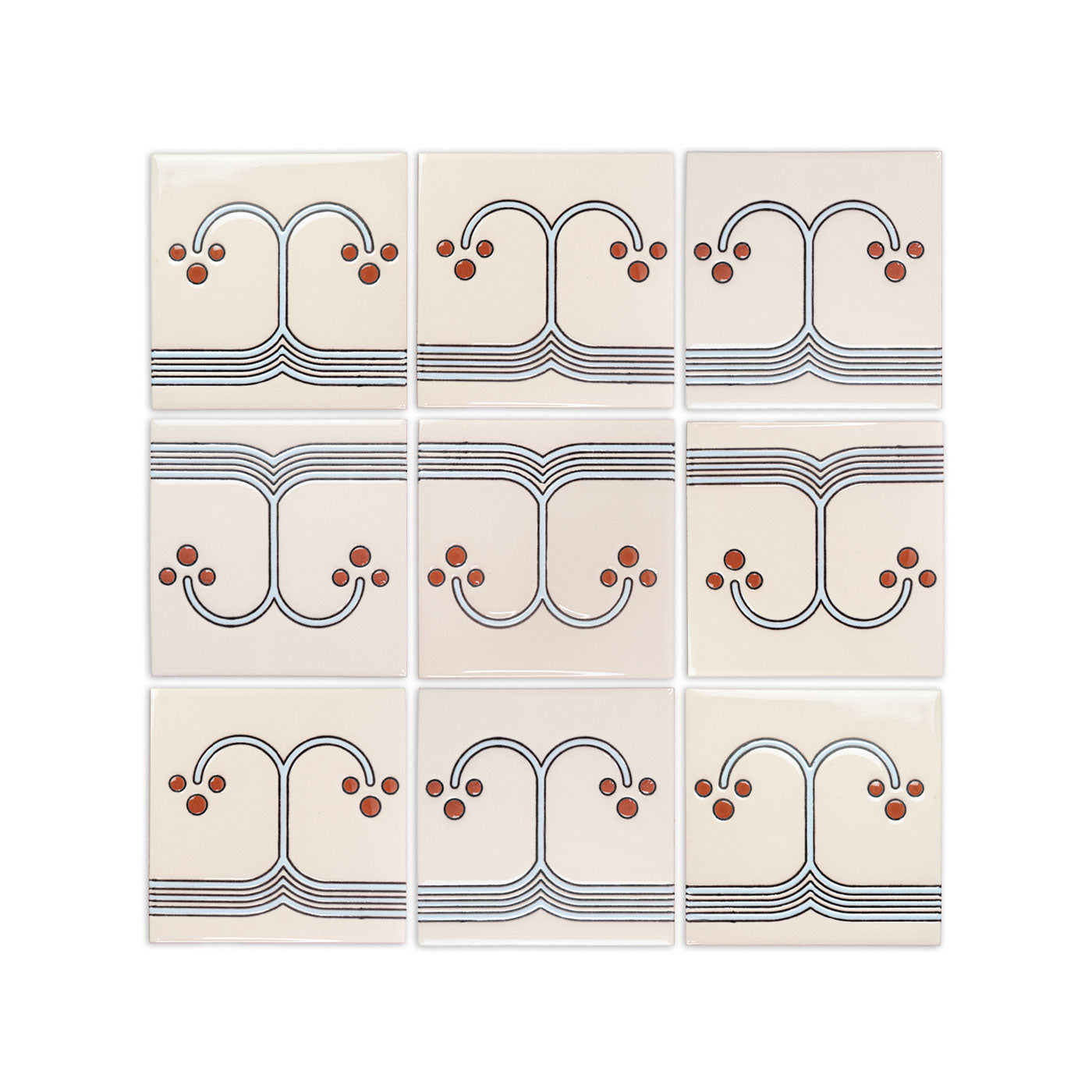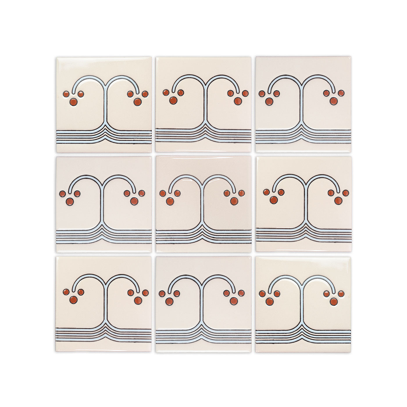 Tiles with geometric lines require careful installation. Using spacers is essential for alignment, and we recommend larger joints to accommodate variations in the hand-screened lines. As these tiles are handcrafted, achieving perfect alignment can be difficult; larger joints can help, while smaller joints may accentuate discrepancies in symmetry.