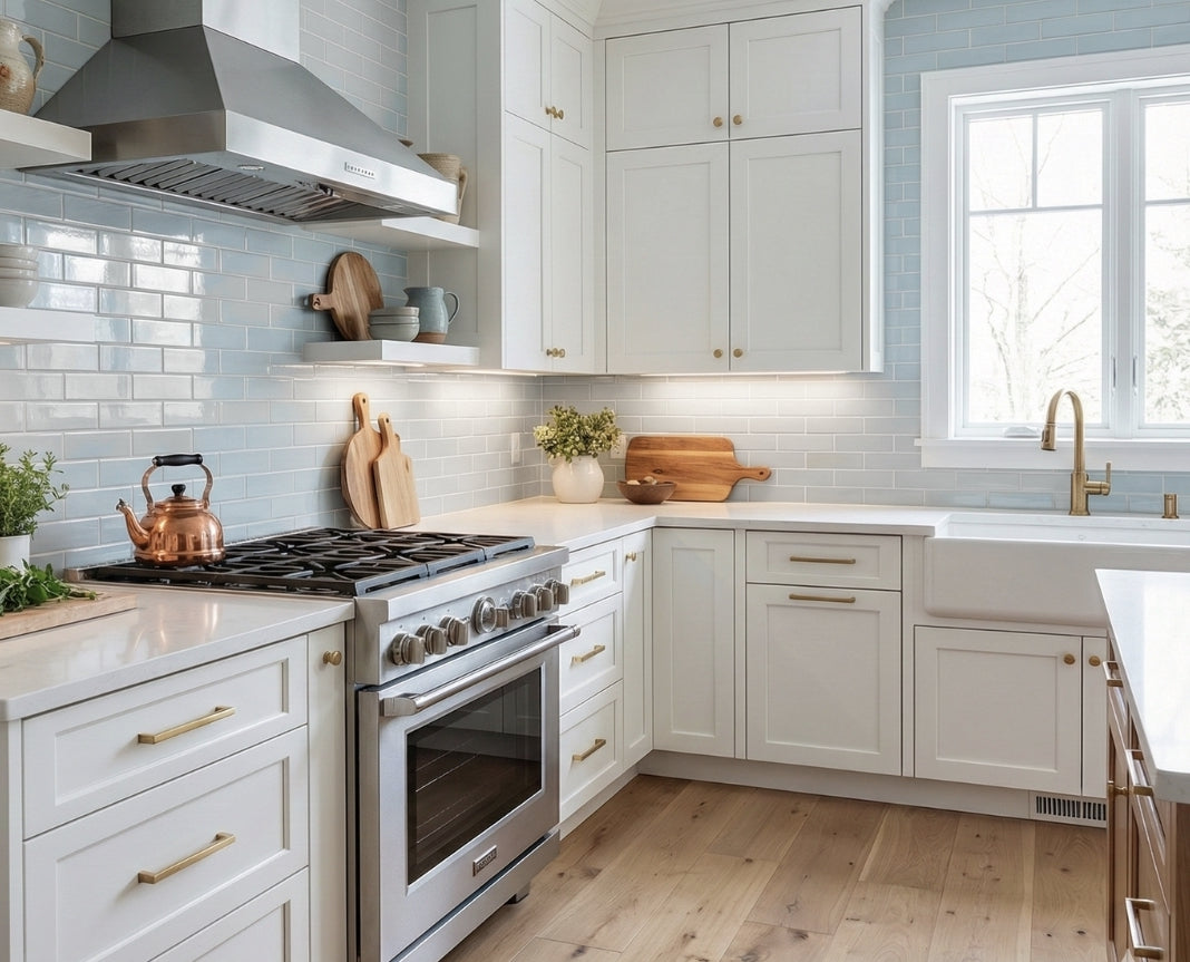 Between 1/8" and 1/4" to accommodate the natural variation that comes with handmade tiles. It’s common for there to be slight size differences, up to ± 1/4", which is completely normal. A slightly wider grout line helps manage alignment and leveling.