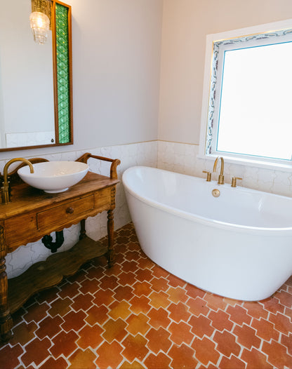 To maintain cleanliness, regularly sweep, dust, or vacuum your terracotta tile. Opt for a soft-bristled broom or a vacuum cleaner. For deeper cleaning, use a damp mop with warm water and our Palo Santo Cleaner Concentrate to remove dirt and grime.to remove dirt and grime.
